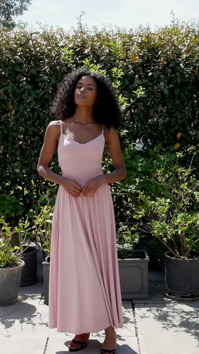 Designed with a flattering subtle basque waist and full, floaty skirt, Cammie lets you move with grace and ease. The soft, double-layered stretch fabric is smoothing and comfortable, and the corset-style waist ties allow you to personalise the fit. Delicate, adjustable straps offer just the right amount of support, plus there’s the option to add discreet bra cup inserts. And, of course, she has pockets - because every great dress should.