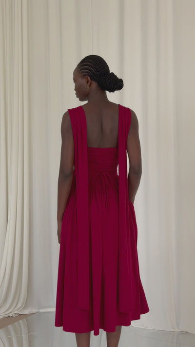 Our signature double-layered stretch fabric hugs your body comfortably through the bodice before flowing into a full, floaty midaxi-length skirt. The subtle basque waist and corset ties softly define your silhouette and make it easy to adjust the fit. Wide, adjustable halterneck ties invite you to style Cleo your way - knotted in a statement bow or crossed at the front for a modern twist. She’s a dress you’ll reach for again and again.