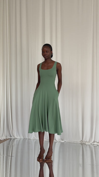 A timeless and versatile midi dress designed to empower your wardrobe. With a reversible neckline, you can choose between a chic high neck or an elegant scoop, effortlessly adapting to any occasion.