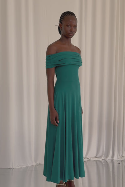 Penelope gives the perfect combination of sexy with the off-the-shoulder panel and pure elegance with a floaty gathered skirt to the ankle. The dress is double-layered throughout for support and coverage, plus it has a hidden bra cup panel for more support if you feel like it.